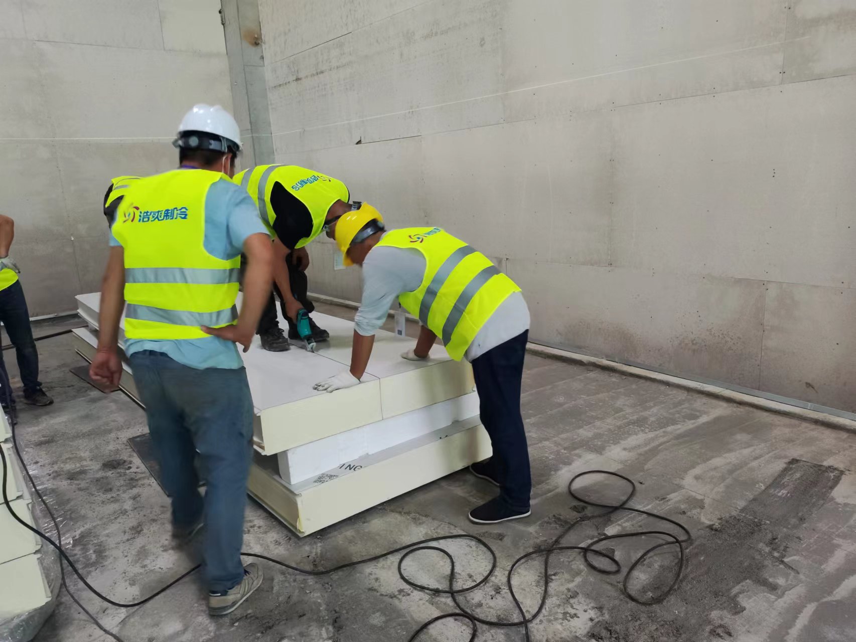 二、保温系统:冷库保温材料采用的是100/150㎜厚度的常州月仙聚氨酯双面彩钢夹芯板,密度40±2kg/m³,平板不压筋,阻燃级别B1。冷库地面保温采用奥诺XPS挤塑板厚度100mm/150(50mm*2层)密度≥27kg/m³,B2级阻燃。库门采用科冷聚氨酯双面彩钢手动平移门,0.8mm双面彩钢,采用全铝合金框架结构,橡胶包装,带防结露电加热,0.8mm双面彩钢,防反锁开门,含应急呼救。